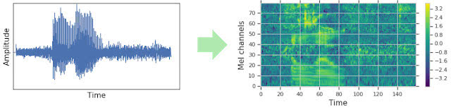 音频波形(时间-振幅)关系转化为梅尔频谱图(时间-梅尔频率),然后再输入网络