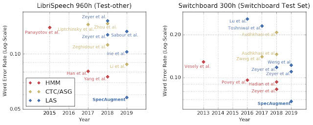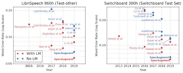 在 SpecAugment 的研究中,作者们意外发现借助 SpecAugment 训练的模型,在不使用语言模型增强的情况下就已经可以击败之前的所有使用语言模型增强的模型。这不仅意味着语音识别模型+语言模型的总体表现也被刷新,更意味着未来语音识别模型完全可以抛弃语言模型独立工作。