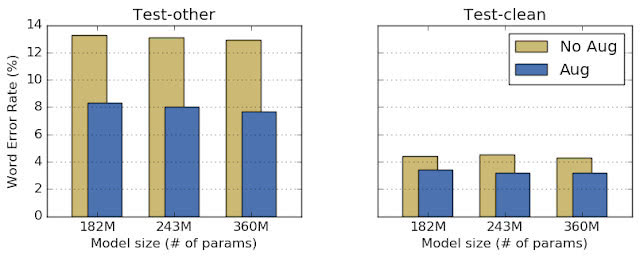 在 LibriSpeech 数据集上的测试中,每组测试中经过数据增强(蓝色条)都取得了更低的单词错误率。Test-other 数据集含有噪声,Test-clean 数据集不含有噪声