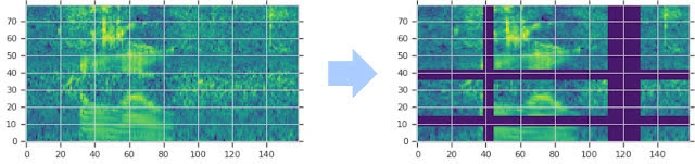 图中的梅尔频谱图经过了时间方向扭曲、多个频率段信号遮蔽(横条)以及多个时间段遮蔽(纵向条)。图中的遮蔽程度有所夸张。