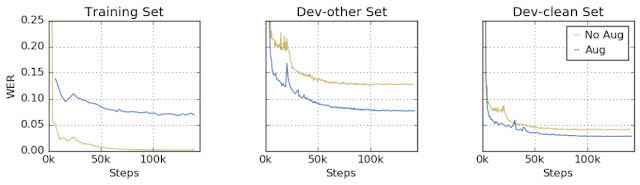 更重要的是,由于 SpecAugment 扩增后的数据里有故意损坏的部分,这避免了模型过拟合到训练数据上。作者们进行了对比试验如下,未使用数据扩增的模型(棕黄色线)在训练数据集上取得了极低的单词错误率,但是在 Dev-other(有噪声测试集)和 Dev-clean(无噪声数据集)上的表现就要差很多;使用了数据扩增的模型(蓝色线)则正相反,在训练数据集上的单词错误率较高,然后在 Dev-other 和 Dev-clean 上都取得了优秀的表现,甚至在 Dev-clean 上的错误率还要低于训练数据集上的错误率;这表明 SpecAugment 数据扩增方法不仅提高了网络表现,还有效防止了过拟合的发生。