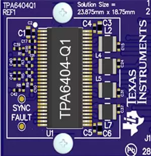 将金属合金3.3μH电感器与流通式设计相结合,可实现业界最小的四通道汽车D类放大器尺寸。图5展示尺寸仅为4.5cm2的TPA6404-Q1完整解决方案(包括放大器和所有必需的无源组件)。