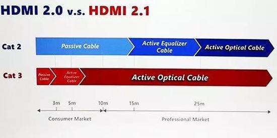 虽然HDMI 2.1优点多多,不过目前看来,HDMI 2.1数据线的外围线材造价过高是制约其普及的重要原因。HDMI 2.0数据线长度在15米内都可以使用无源线,而HDMI 2.1高速数据线长度一旦超过3米,就需要添加供电来驱动信号的传输,超过5米后纯铜线也无法满足需求,需要使用到AOC,即有源光缆。由于光纤、光电转换等模块成本高企,目前,一根20米长的HDMI 2.0有源光缆价格高达四五百元,同样需要采用有源光缆的HDMI 2.1价格只可能会更高。HDMI2.1的线缆问题,很有可能将会影响8K电视的普及。