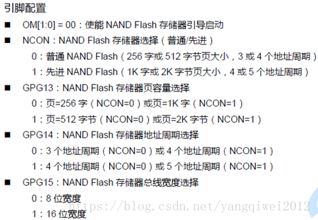 S3C2440提供OM[1:0],NCON,GPG13,GPG14,GPG15这5个信号来选择NAND FLASH启动,参见S3C2440中文手册,可知: