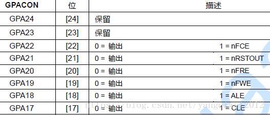 GPACON : 将GPA17—GPA22设置为NAND FLASH控制器信号;