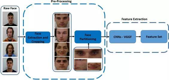 团队主要研究面部的不同部分如何有利于识别,以及在机器学习场景中如何在对面部照片进行不同程度旋转、缩放的识别。实验使用基于CNN的架构以及预训练的VGG-Face模型来提取特征。然后使用两个分类器,即余弦相似度(CS)和线性SVM来测试识别率。下图表现了特征提取步骤的概述: