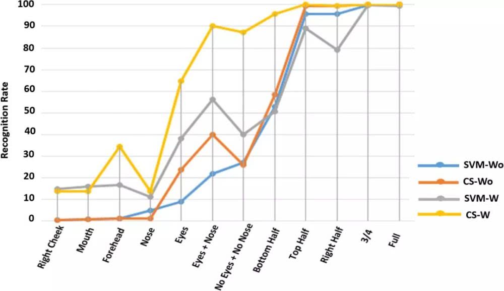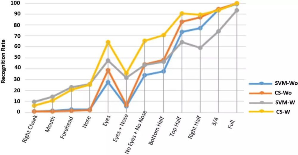在LFW数据集上,分别使用SVM和CS两种分类器对训练中未使用/使用的人脸各部分进行识别