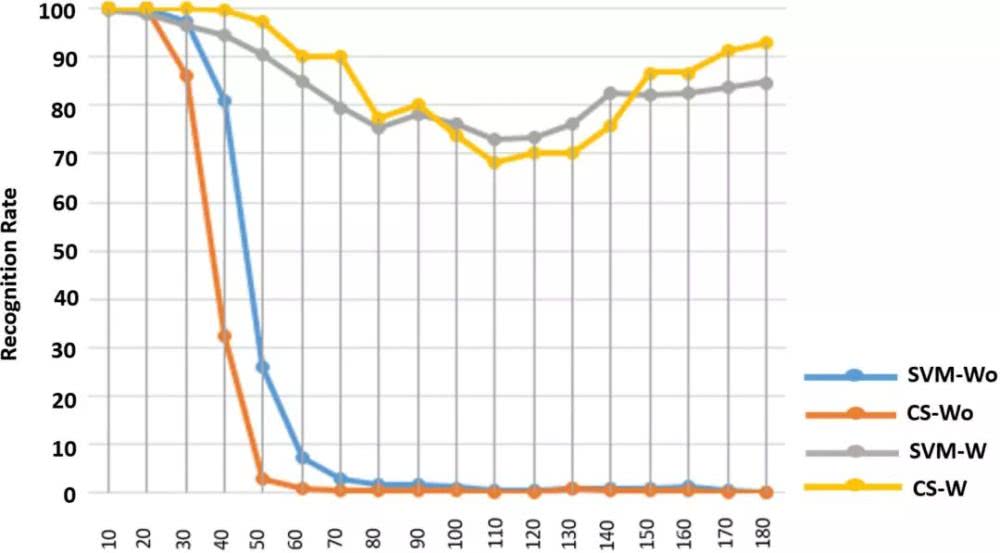 在FEI数据集上使用SVM和CS分类器的人脸识别率(基于训练集中没有和有旋转人脸图片)