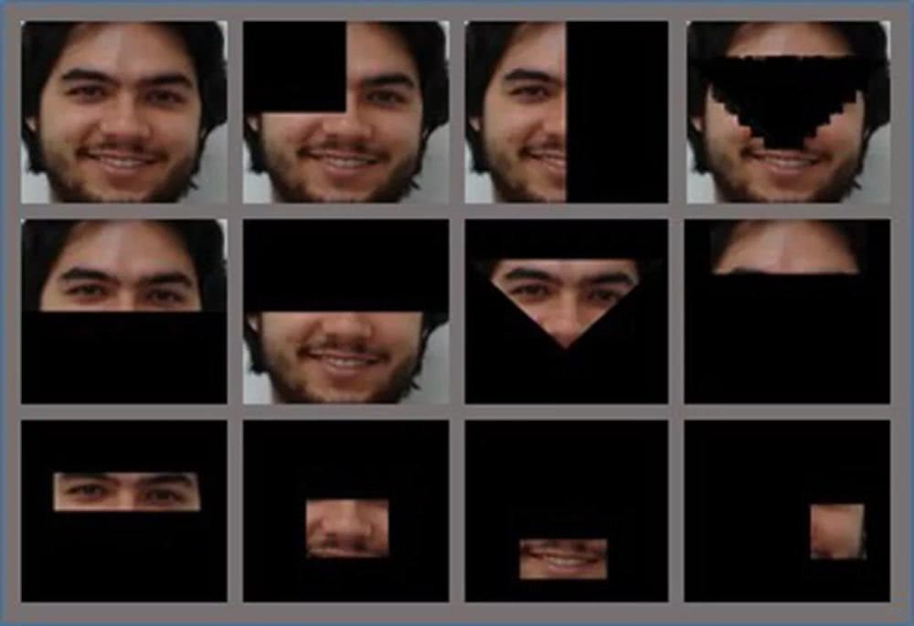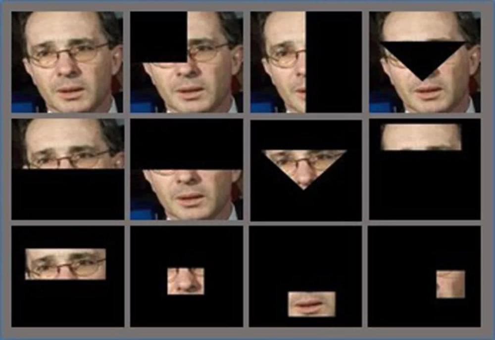 顺着这个逻辑,研究团队使用有遮挡的不完整人脸照片作为测试集,下面是一个测试集的示例图片,以及计算机对不完整人脸照片的识别过程。