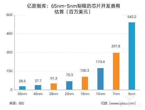 芯片制程决定开发成本。根据IBS的估算数据,按照不同制程,65nm芯片开发费用为2850万美元,5nm芯片开发费用则达到了54220万美元。因此,在芯片的研发上,错误的容忍几乎是零。目前,较为成熟的是40nm和55nm工艺,而对于当下先进的7nm工艺,很多企业的技术还不够成熟。