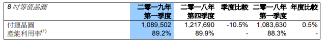 2019年第一季,中芯国际的产能利用率为89.2%,付运晶圆(约当8吋)为1089502片。