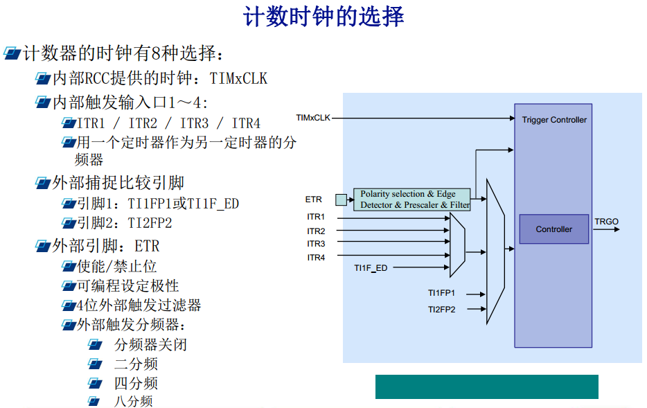 4) 内部触发输入(ITRx):使用 A 定时器作为 B 定时器的预分频器(A 为 B 提供时钟)