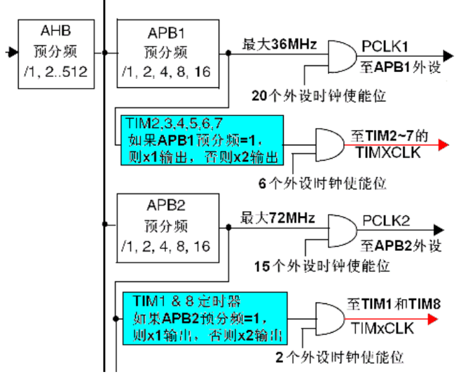 这些时钟,具体选择哪个可以通过 TIMx_SMCR 寄存器的相关位来设置。这里的CK_INT时钟是从 APB1 倍频的来的,STM32 中除非 APB1 的时钟分频数设置为 1,否则通用定时器 TIMx的时钟是 APB1 时钟的 2 倍,当 APB1 的时钟不分频的时候,通用定时器 TIMx 的时钟就等于APB1 的时钟。这里还要注意的就是高级定时器的时钟不是来自 APB1,而是来自 APB2 的。