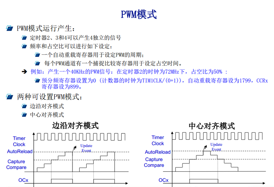 ②16 位向上、向下、向上/向下(中心对齐)计数模式,自动装载计数器(TIMx_CNT)。