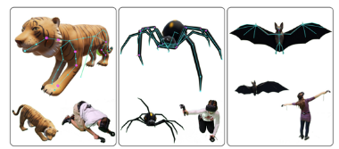 该团队主要集中研究了三种类型的虚拟身体,包括地上跑的四足动物——老虎,墙上爬的六足动物——蜘蛛,和天上飞的带翼动物——蝙蝠。它们的形状、骨骼、移动姿势都和人体完全不同, Krekhov 想以此探索我们获得虚拟身体所有权的极限。