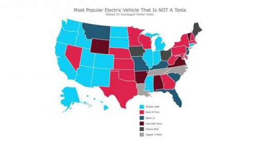 从这张推特地理标记的画面上,我们大致可以了解下目前几款主流电动汽车的受欢迎范围。一眼望去,日产聆风占据面积最大,美国17个洲有地理标记,毫无疑问是最受欢迎的车型。但聆风也不能高兴的太早,紧跟其后的奥迪E-Tron也在16洲有所表现。相比于奥迪家的新秀,聆风的续航一直算不上优势,又恰逢日产全球裁员12500人,让人不禁为日产在纯电领域的布局捏一把汗。