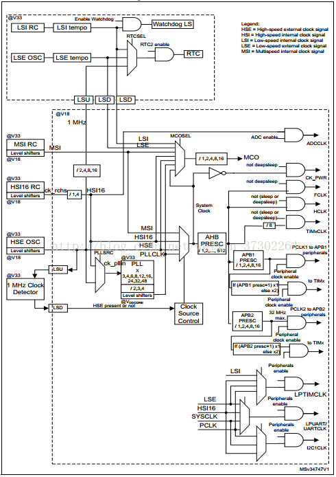 3、MSI RC,全称为Multispeedinternal RC oscillator,是stm32lxx低功耗系列独有的时钟,可提供12种频率的时钟源,范围可以从100KHZ到48MHZ之间变化。可以直接选择为系统时钟和AHB时钟,也可以作为MCO的时钟源。MSI为低功耗模式提供了更多的选择,但是精度不高。官方提供的例程中多以MSI作为时钟源。