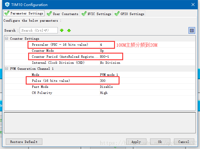 TIM10使用的频率为100M,这里分频为20M,按照图中设置的周期,输出的PWM波形的频率大概在25K左右。