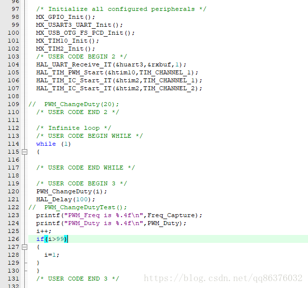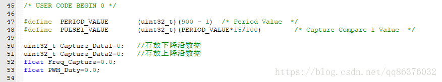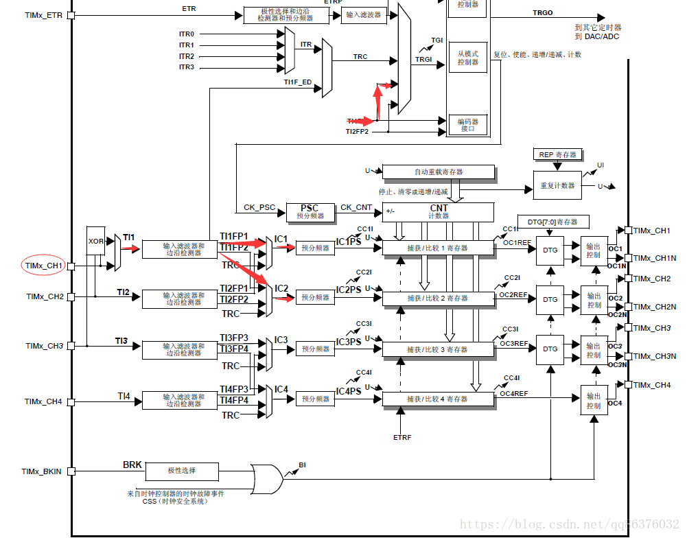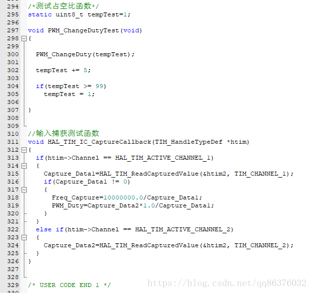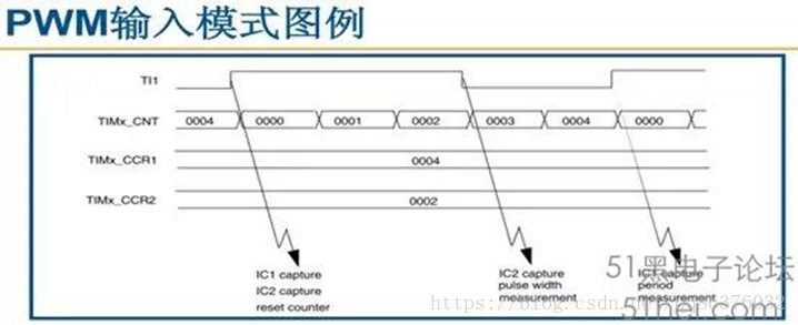注意图中红色标记的地方。这样设置之后,IC1,IC2可以对同一信号进行捕获,IC1在上升沿捕获,每次上升沿触发中断,读取对应捕获寄存器的数据就可以计算频率,读取IC2的捕获寄存器可以计算占空比。