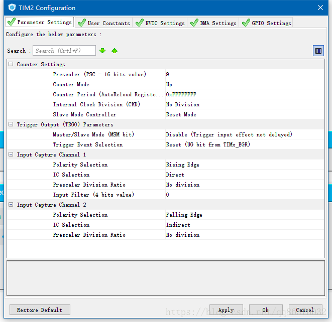 使能从模式,并且工作在复位模式,且触发信号源是TI1FP1,也就是在TI1FP1的上升沿,会复位所有的计数器,并更新对应的寄存器。定时器2分频之后使用10M的信号源。此处设置的重点是,将IC1捕获设置为上升沿捕获,且设置为直连模式,IC2设置为下降沿捕获。