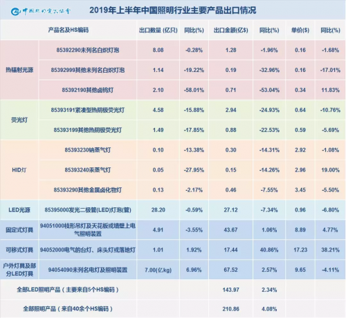 2019年上半年,中国照明全行业出口额约为210.86亿美元,整体同比略有增长达4.08%。
