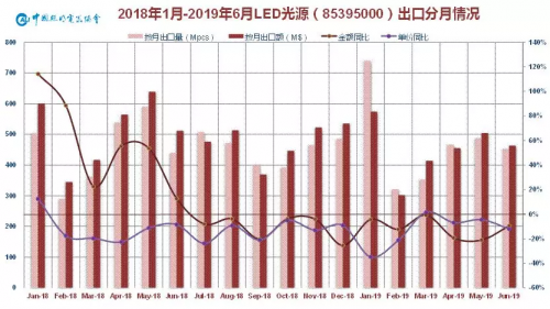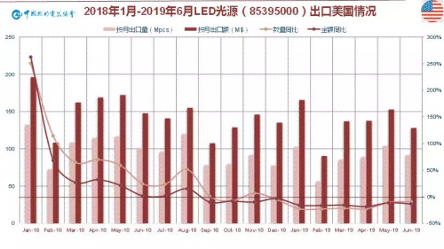 2019上半年我国LED照明对美出口约34.01亿美元,同比去年上半年的36.89亿美元下降7.80%,总体不如预想中下滑幅度大。