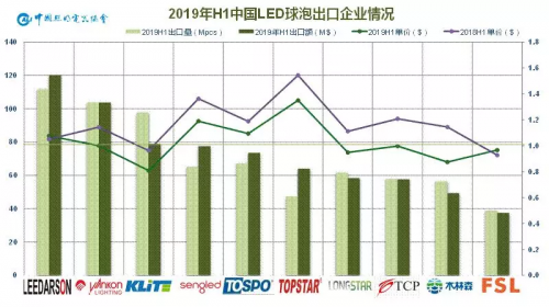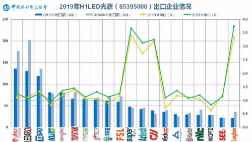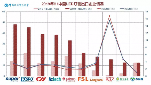LED灯管方面,山蒲稍稍领先,取得2019年半程冠军,得邦上半年的灯管上量很快,已冲至次席,晨辉紧随其后,快捷达则从去年头名滑落至第四;爱丽思和普为主打日本市场,因而产品出口单价虽有下滑仍维持高位。