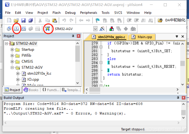 如上图,点击左边红圈编译,显示没有错误后点右边红圈下载,如果下载不成功,请重复阅读【ST-Link+V2使用教程+V5.0】2015年.pdf 4.3在Keil软件调试和下载,正常情况下,开发板上的两个红灯交替闪烁。到此,开发环境和硬件连接工作完成。以上写的比较简单,以后各篇也是这样,只写知识点,细节部分网上都有,不再赘述。以后各部分有完整软件代码,充分考虑异常和容错,有较强的软件滤波和抗干扰能力,具备工业级水平,可用于实际控制。