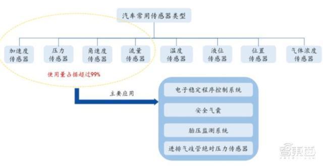 MEMS 传感器是在半导体制造技术基础上发展起来,采用微电子和微机械加工技术制造出来的新型传感器。MEMS 传感器广泛应用于电子车身稳定程序(ESP)、防抱死(ABS)、电控悬挂(ECS)、胎压监控(TPMS) 等系统。其中,压力传感器、加速计、陀螺仪与流量传感器是汽车中使用最多的 MEMS 传感器,占汽车 MEMS 系统的 99%。