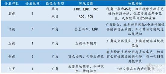 ADAS 系统配套 6 个以上摄像头。根据不同 ADAS 功能的需要,摄像头的安装位置也有不同。主要分为前视、后视、侧视以及内置。实现自动驾驶时全套 ADAS 功能将安装 6 个以上摄像头,前视摄像头因需要复杂的算法和芯片,单价在 1500 元左右,后视、侧视以及内置摄像头单价在 200 元左右。ADAS 的普及应用为车载摄像头传感器带来了巨大的市场空间。