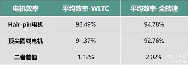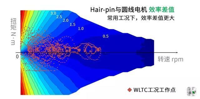 其次,所谓的“1%”,指的是在WLTC工况下两者的平均效率差,Hair-pin电机要高1.12%。但是在全域平均下,两者效率值相差达到2%。低速大扭矩工作点,最高甚至可提升效率10%。