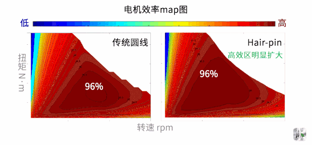 刚刚说了,Hair-pin电机提高裸铜槽满率20%~30%。相同体积情况下,Hair-pin电机可以塞进更多的定子绕组,这样在相同损耗下Hair-pin电机可以能输出更高的功率和扭矩。
