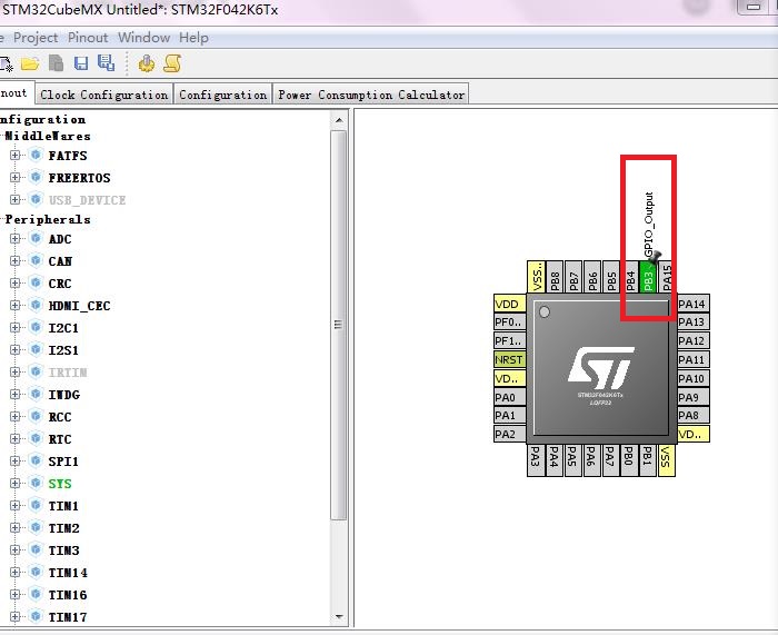 完成上一个对话框,就可以进入管脚、时钟等的配置,点击相应的管脚就会弹出管脚模式选择的对话框,图中选作输出模式
