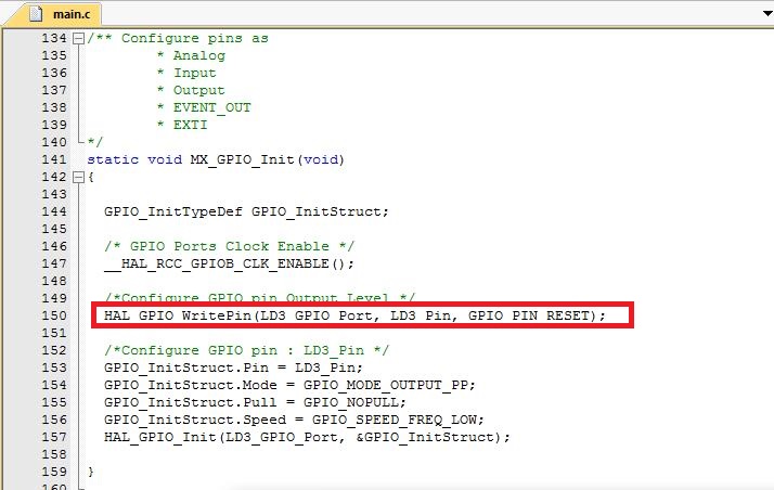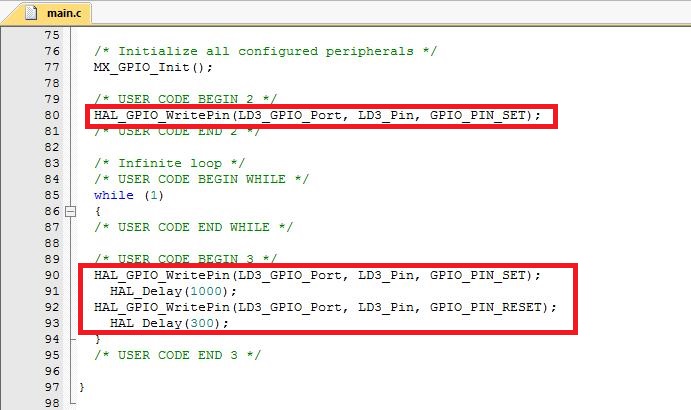 打开main.c 可以看到STM32CubeMx自动生成的初始化代码,在GPIO的初始化代码里找到LED所对应的GPIO初始化代码,复制红色框部分