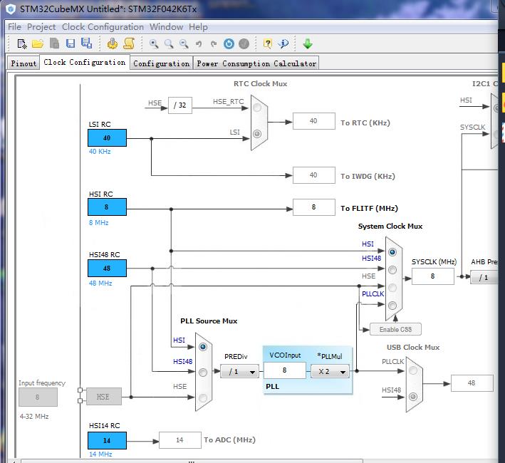 点击“Clock Configuration”可以配置时钟,这里没有作特殊配置,就作默认选择,其他选项卡也不作特殊配置。