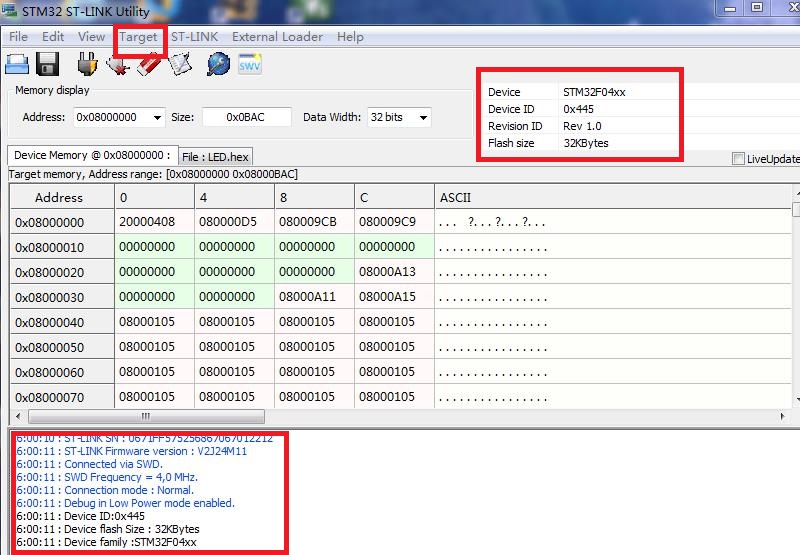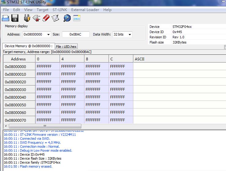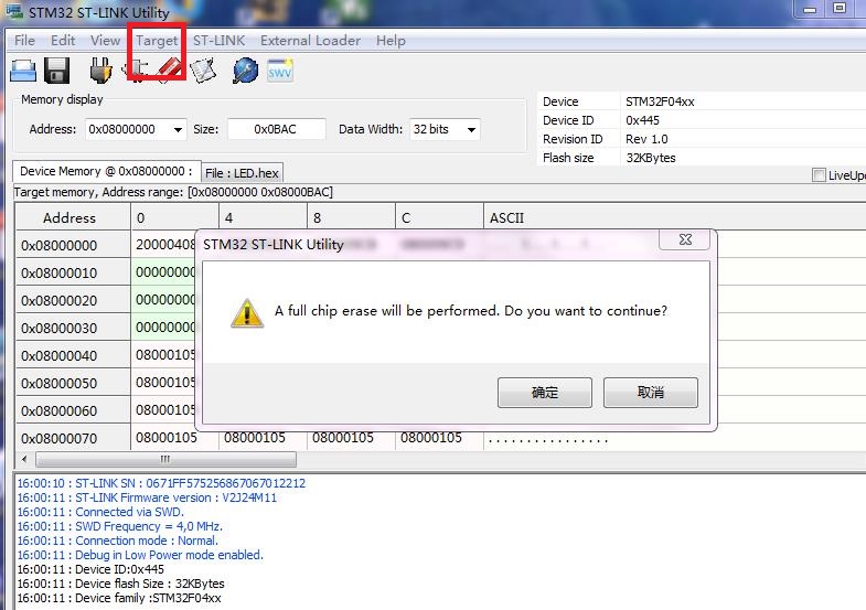 点击Target->erase chip,擦除芯片中原有的程序,点击确定。