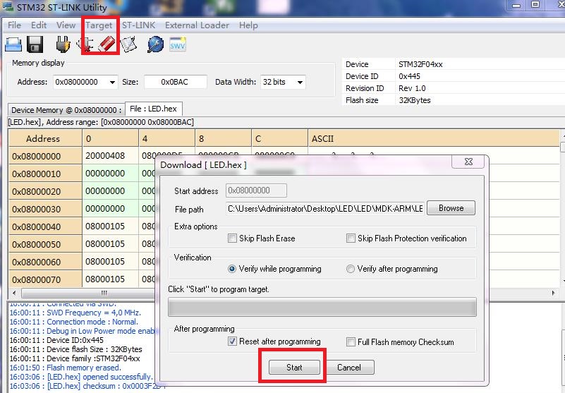 点击Target->Program &verify 烧写程序,弹出对话框,点击start