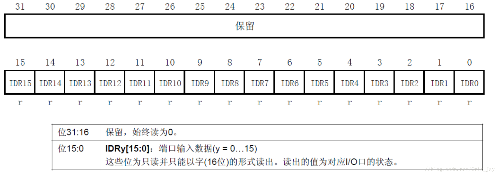 IDR是端口输入数据寄存器,只用了低16位,该寄存器是只读寄存器,并且只能以16位形式读出。