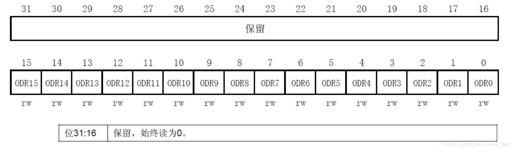 ODR为端口输出数据寄存器,只用了低16位,可读写,读出来的状态可作为IO口输出状态的判断,写数据则改变对应IO端口的电平状态。