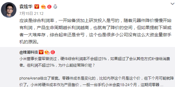 “应该是综合利润率,一开始备货加上研发投入是亏的,随着元器件降价慢慢开始有利润,产品生命周期越长利润越高,也就有了降价的空间,但如果提前下架或者一大堆库存,综合起来还是会亏,这个也是很多小公司没有这么大资金量做手机的原因。”
