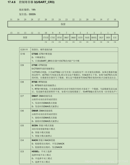 4.如果采用多缓冲器通信,配置USART_CR3中的DMA使能位(DMAT)。按多缓冲器通信中的描述配置DMA寄存器。