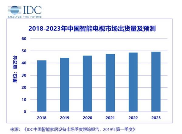 根据《IDC中国智能家居设备市场季度跟踪报告》显示,2019年第一季度中国智能电视市场出货量约为1084万台,同比增长1.7%。另外,市场研究机构IDC还预计给出,未来智能电视市场将继续保持稳步增长,到2023年市场出货量将达到4938万台。