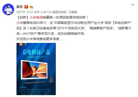 事实上,在小米CEO雷军看来,小米电视之所以能够拿下中国销量第一,其关键原则就在于持续创新。8月7日,雷军发布微博表示:“小米电视销量第一原因就是持续创新!小米壁画电视65英寸,在“中国智能显示与创新应用产业大会”荣获“彩电创新产品”奖!此前已经接连获得“2019十佳电视大奖”、“高端智能产品奖”、“迪斯普大奖—AIoT技术”等多项大奖,成功站稳高端市场。”