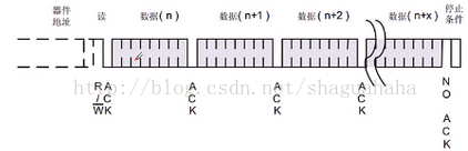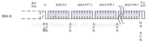 在从机给主机发送完一个8位字节数据后,主器件产生一个应答信号来响应,告诉从机主器件要求更多的数据,对应每个主机产生的应答信号,从机将发送一个8位数据字节。当主器件不发送应答信号而发送停止位时结束操作。