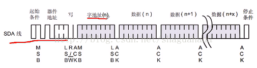 (2)、页写操作的启动和字节写一样,不同在于传送了一字节数据后并不产生停止信号,主器件还可以被允许额外再发送7或者15个字节。