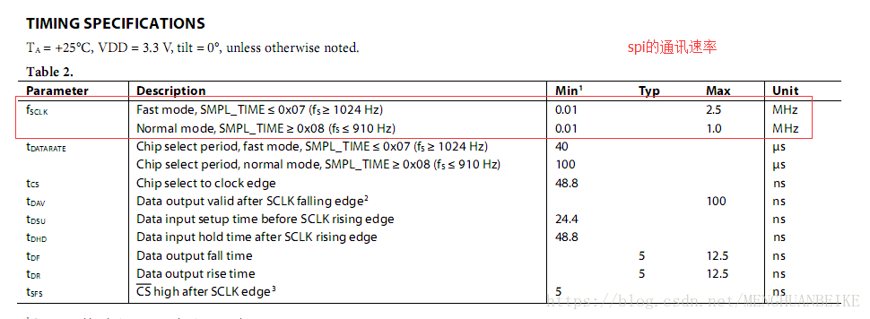 从时序规格表可知该芯片的spi通讯速率最快是2.5MHz,普通模式是1MHz。