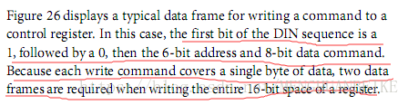 从手册可知该芯片写一个字节的数据需要发两帧数据,每帧数据有两个字节,高字节是寄存器地址,低字节是要写的数据内容,地址的字节还需要把字节高位置1来表示写数据。