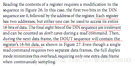 读数据的时候需要发送一个读取数据的命令帧,该数据帧分两个字节,高字节需携带寄存器的地址(6位)(寄存器有两个地址,随便一个地址都可以),地址字节高位需置1表示读操作,数据帧的低字节可以不用管(填入任意数据都可以)。芯片接收该读数据的命令帧则会通过MISO返回寄存器存储的16位数据。