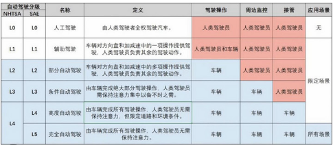 目前,自动驾驶的等级划分主要有两个标准,一个是由美国的NHSTA(国家高速路安全管理局)所制定的从L0-L4一共五个等级,另一个则是由SAE International(国际汽车工程师协会)所制定的从L0-L5一共六个等级,目前国际上比较主流的就是SAE的分级方式。