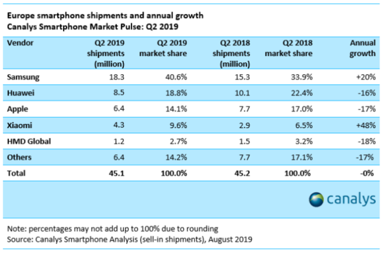 第三方市场调研机构Canalys发布了2019年第二季度欧洲智能手机市场的报告,具体如下: